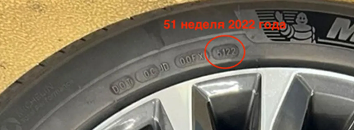 Если автомобиль относительно новый, то зачастую дата его производства будет схожа с датой производства шин. Смотреть дату выпуска необходимо на внешней стороне колеса, как правило, она входит в состав серийного номера. Необходимо обратить внимание на последние 4 цифры: из них первые две – это неделя изготовления, например, 51, что соответствует примерно 16-22 декабря, вторые две – это год производства. В нашем примере – 22 соответствуют 2022 году.