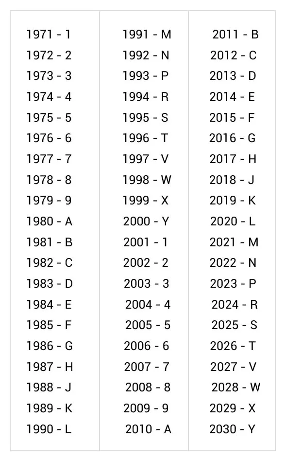 Расшифровать цифренно-буквенное обозначение года выпуска поможет данная таблица: