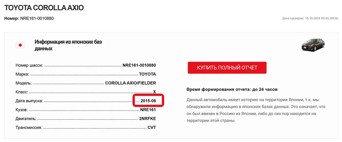Бесплатно определить дату выпуска японского автомобиля по номеру кузова можно также при помощи сервиса RealCar. Введите в строку поиска номер кузова, и вам отобразятся месяц и год выпуска. Полная дата выпуска в формате день.месяц.год доступна в полном платном отчете.