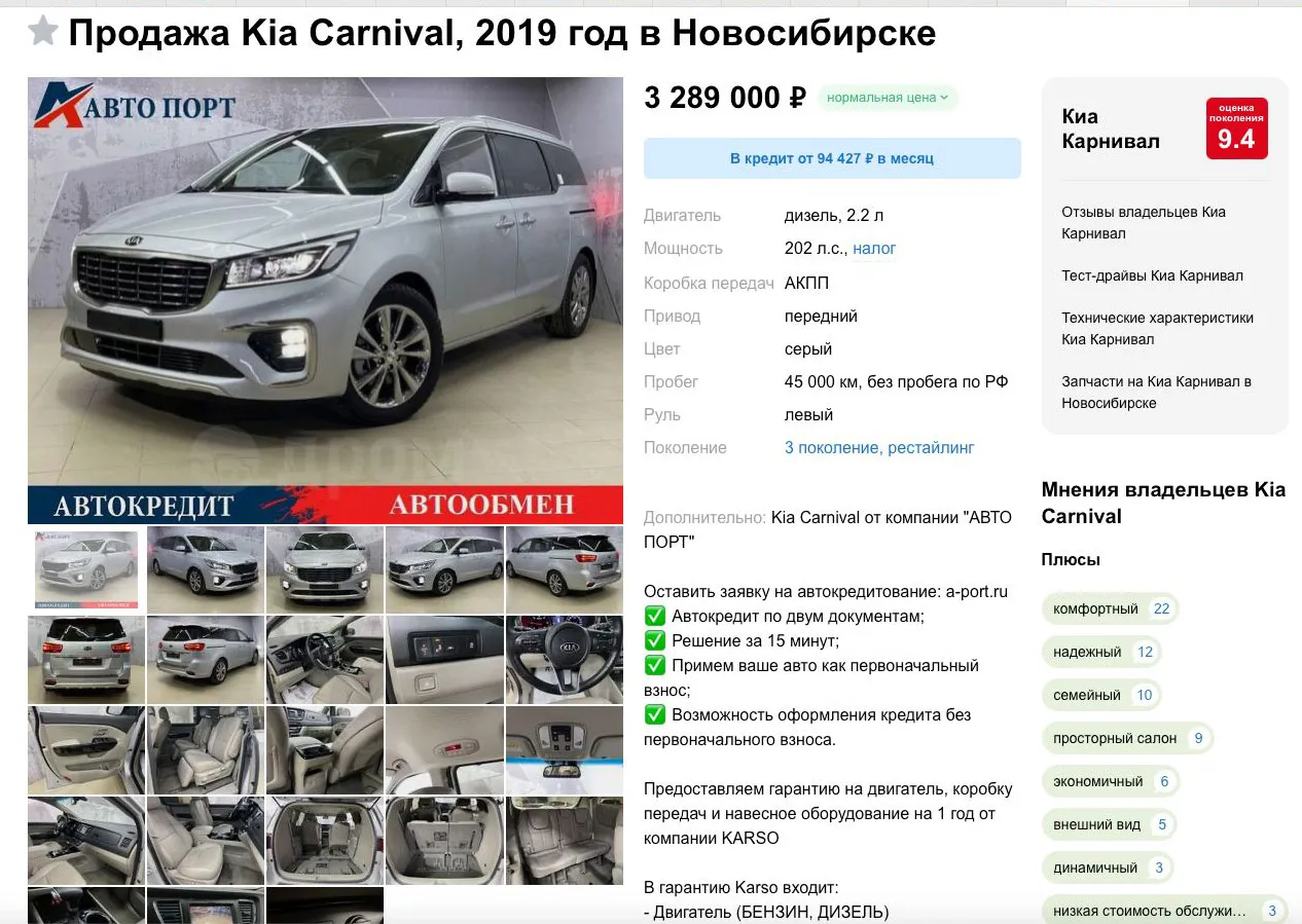 На одной из досок объявлений в продажу выставлена машина Kia Carnival 2019 года выпуска, VIN-номер KNAMB81ABLS637085, заявленный пробег: 45 000 км.